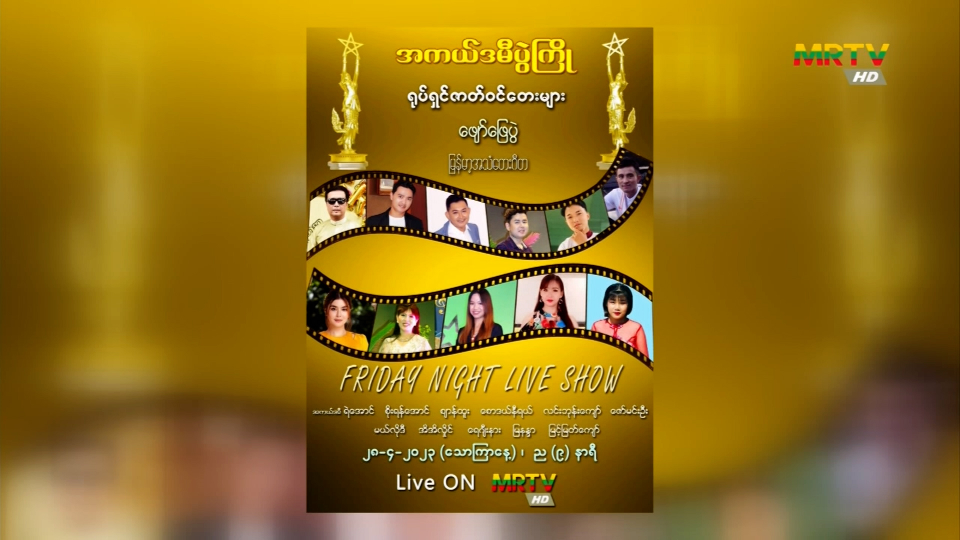 "အကယ်ဒမီပွဲကြို" ရုပ်ရှင်ဇာတ်ဝင်တေးများ ဖျော်ဖြေပွဲကို ဧပြီလ ၂၈ ရက်နေ့ည ၈ နာရီ သတင်းများအပြီးတွင် ထုတ်လွှင့်ပြသမည် သောကြာနေ့, ဧပြီလ 28, 2023