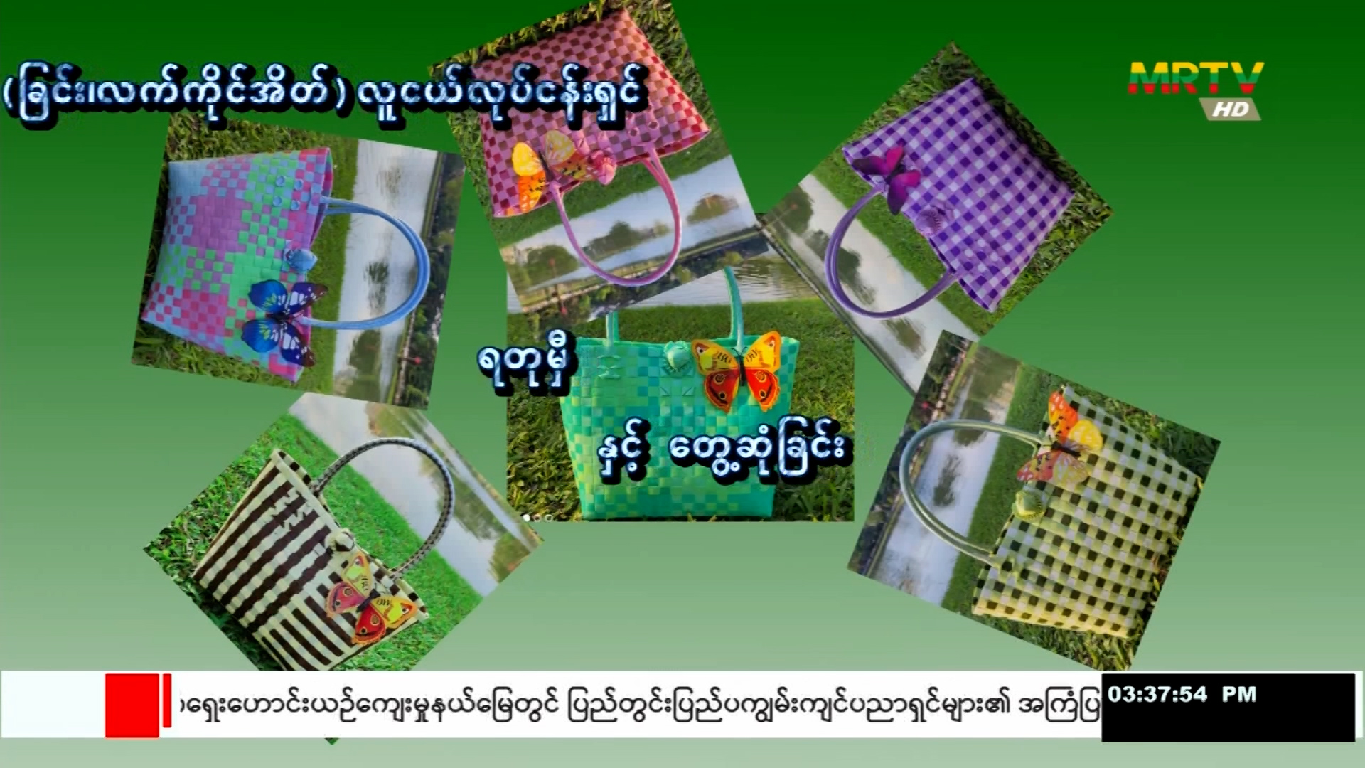 ရုပ်သံမှတ်တမ်းအစီအစဉ် “ပလတ်စတစ်ရောင်စုံများဖြင့် ပြုလုပ်ထားသည့် Handmade ခြင်း၊ အိတ်နှင့် အခြားလူသုံးကုန်ပစ္စည်း အချို့တို့ကို ထုတ်လုပ်နေသည့် မရမ်းကုန်းမြို့နယ်မှ Yatu Handmade & Clothes ၏ ပဲ့ကိုင်ရှင် လူငယ်တစ်ဦးဖြစ်သည့် မရတုမီနှင့် တွေ့ဆုံမေးမြန်း” သောကြာနေ့, မတ်လ 08, 2024