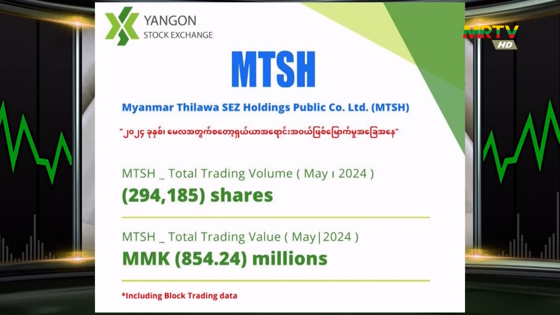 ရန်ကုန်စတော့အိတ်ချိန်း ဈေးကွက်တွင် မေလအတွင်း MTSH ၏ အစုရှယ်ယာ အများဆုံး အရောင်းအဝယ်ဖြစ်ခဲ့