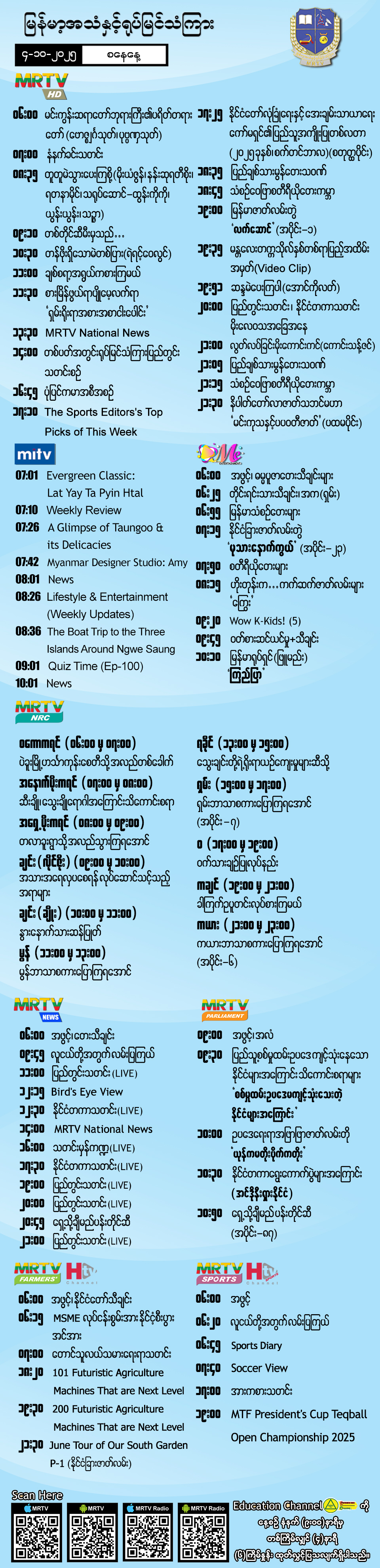 ၄-၁၀-၂၀၂၅ ရက်နေ့တွင် ထုတ်လွှင့်ပြသမည့် အစီအစဉ်များ